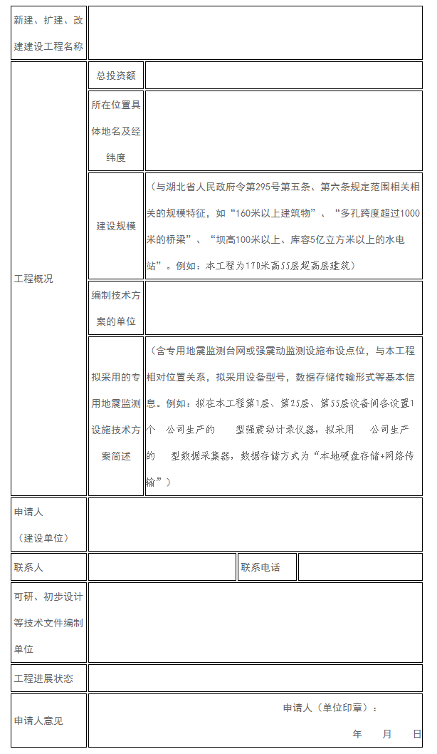 应当建设专用地震监测台网和强震动监测设施的重大工程和可能产生严重次生灾害建设工程的审批行政许可申请表