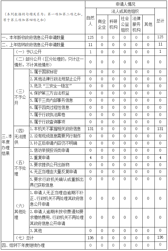 严格按照《条例》规定,规范政府信息公开申请受理、审查、答复流程,确保申请办理依法合规、按时办结,切实保障人民群众知情权。2025年度,我办共接收并处理政府信息公开申请136件(含上年度结转11件),办理结果分类如下:予以公开1件,部分公开0件,无法提供131件(均因本机关不掌握相关政府信息),不予处理4件(均为重复申请),无结转下年度办理事项。对无法提供相关信息的申请,均已向申请人做好政策解释和情况说明,确保办理过程透明、回应到位。